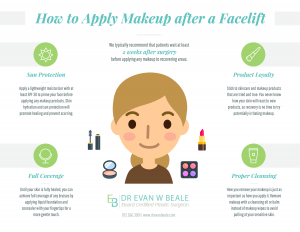 Dr. Beale created this helpful infographic to help patients know how to apply makeup after a facelift. Dr. Beale typically recommends that patients wait at least 2 weeks after surgery before applying any makeup to recovering areas. For more information about the facelift procedure or recovery, please contact Dr. Beale.